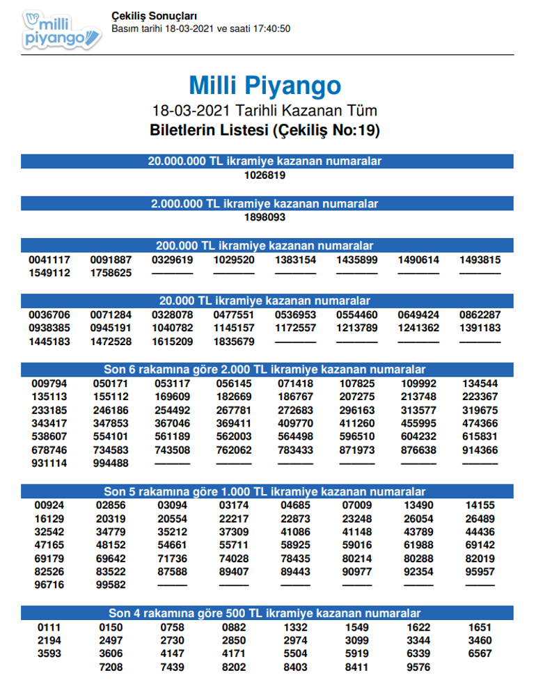 Belirtilen tarihlerin dışında, çekiliş günleri ve planarı farklı özel çekilişler düzenlenebilir. Milli piyango i̇daresi genel müdürlüğünün düzenlediği sayısal loto, şans topu, on numara, süper loto ve milli piyango çekiliş sonuçlarına ait analizler ve istatistik verileri sunan web sitesi. 5 bin tl kazandıran numaralar devamı. Milli piyango biletlerinin basımı, türkiye cumhuriyeti merkez bankası ile güvence altına alınmıştır. Milli piyango'nun son 4 yılda yapılmış çekiliş sonuçlarında.
